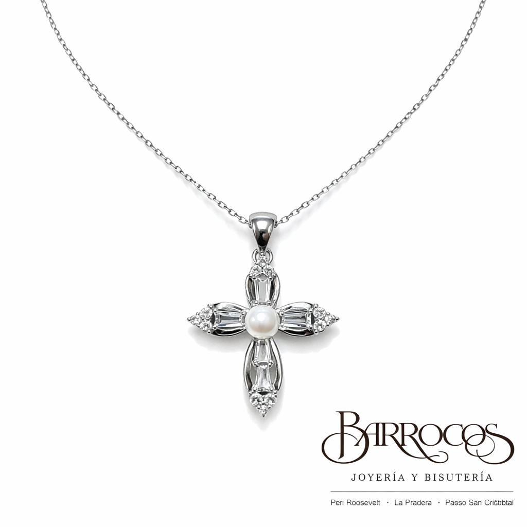 Cadena Plata Italiana 925, con Cruz de Perla Cultivada con Circonia, Tamaño Pequeño