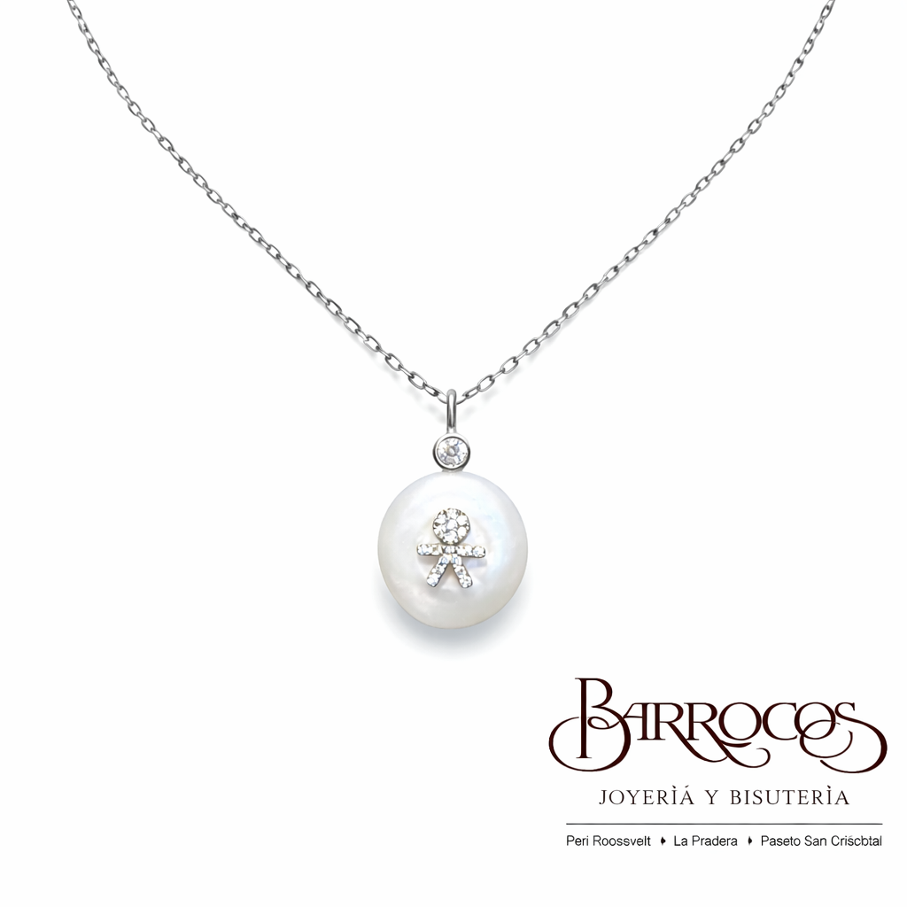 Cadena Plata Italiana 925, con Dije de Madre Perla y Niño con Circonia en, Tamaño Pequeño