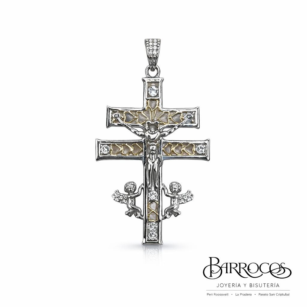 Dije Plata Italiana 925, Cruz de Caravaca con detalles Dorados Grande